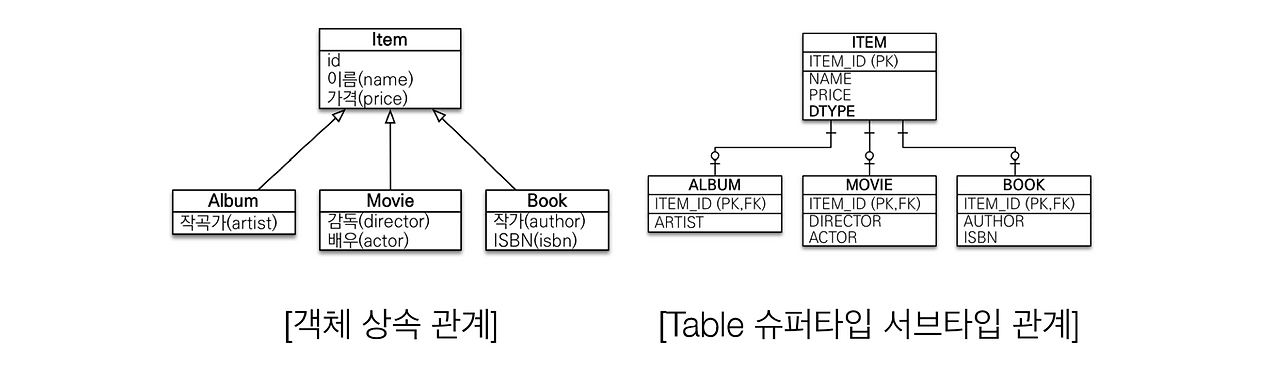 JPA를 사용하여 얻을 수 있는 가장 큰 것은 SQL아닌 객체 중심으로 개발할 수 있다는 것이다. 이에 따라 당연히 생산성이 좋아지고 유지보수도 수월하다. 또한 JPA는 패러다임의 불일치도해결하였다. 예를 들면 JAVA에서는 부모클래스와 자식클래스의 관계 즉, 상속관계가 존재하는데 데이터베이스에서는 이러한 객체의 상속관계를 지원하지 않는다(상속 기능을 지원하는 DB도 있지만 객체 상속과는 다름). 이런 상속관계를 JPA는 아래와 같은 방식으로 해결하였다.
