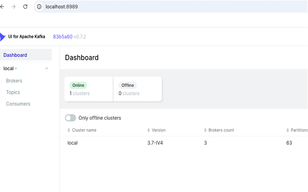 위 도커파일 작성 후 docker-compose up -d –build 명령어로 구동합니다. 이후 localhost:8989 에 접속하면 아래와 같은 화면이 나타납니다. Kafka의 구성 요소인 Topic, Producer, Consumer, Broker 의 정보를 ui로 볼 수 있습니다.