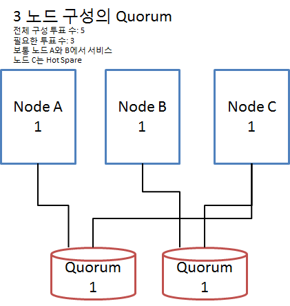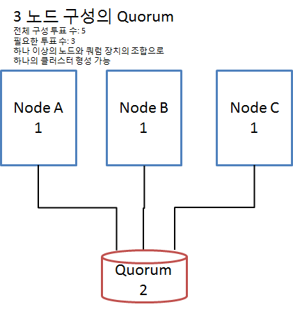 - 쿼럼 리소스 : 클러스터 구성 및 상태 데이터에 대한 저장소로 클러스터 복구에 필요하다
