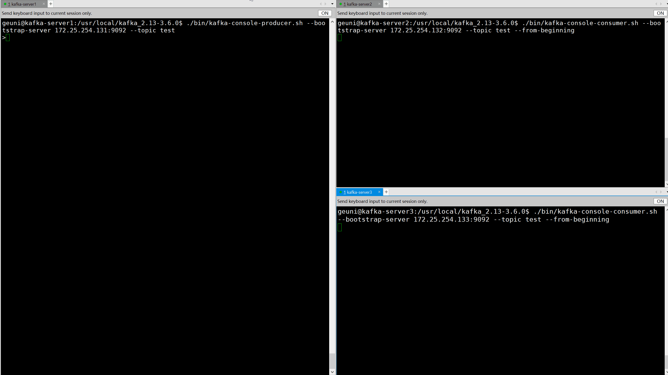 cluster 정상작동여부를 확인하기 위하여 #1 서버에서 메시지를 생성하여 #2, #3번에서 메시지를 받아보자.