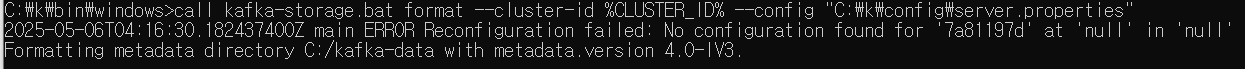 call kafka-storage.bat format --cluster-id %CLUSTER_ID% --config "C:\kafka_2.13-4.0.0\config\server.properties"