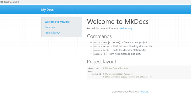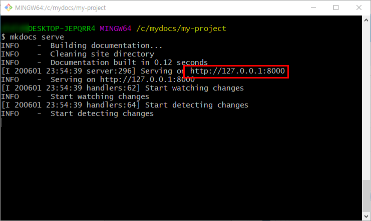 mkdocs serve를 입력하시면 됩니다.