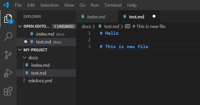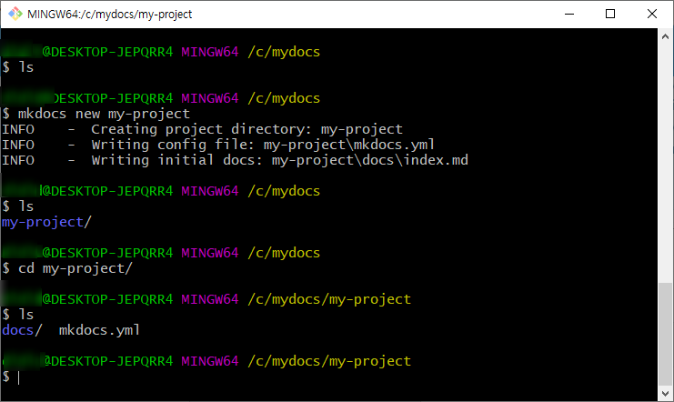 그 안에 docs 폴더와 mkdocs.yml이 생깁니다.