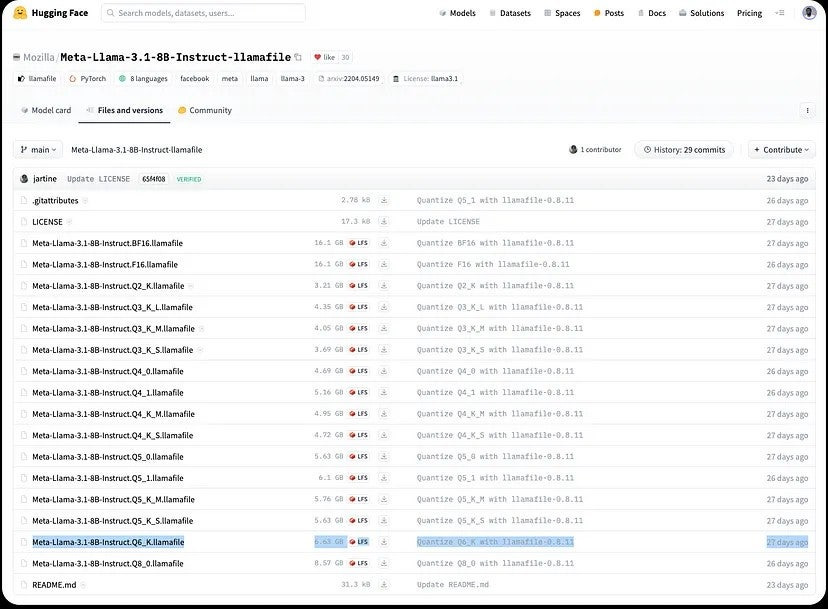 라마파일을 설치하려면 허깅페이스 웹사이트로 이동하여 탐색 메뉴에서 모델을 선택한 다음 라마파일을 검색합니다. 아래 URL에서 원하는 정량화된 버전을 설치할 수도 있습니다.