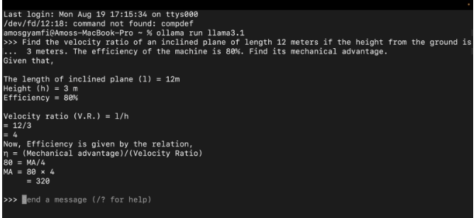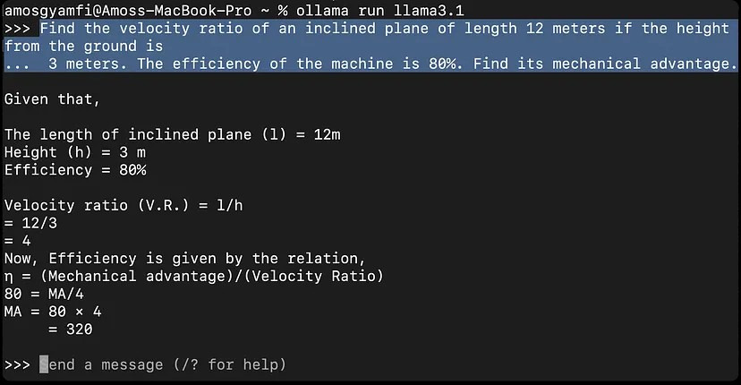 위의 예에서는 llama3.1 모델에 물리 작업 및 에너지 문제를 풀라는 메시지를 표시합니다.