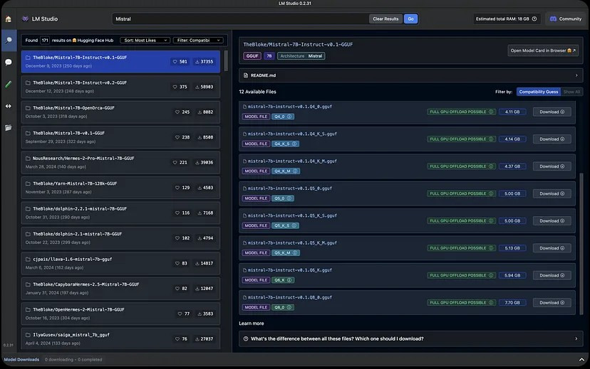 특정 회사의 모델을 검색하면 소규모 모델부터 대규모 모델까지 여러 모델이 표시됩니다. LM Studio는 머신에 따라 호환성 추측을 사용하여 해당 머신 또는 플랫폼에서 작동할 모델을 강조 표시합니다.