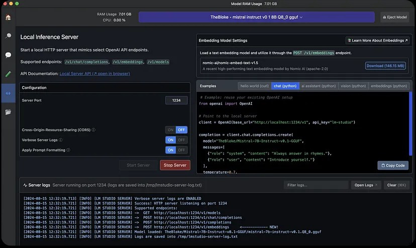 로컬 서버는 샘플 Curl 및 Python 클라이언트 요청을 제공합니다. 이 기능은 LM Studio를 사용하여 특정 LLM에 액세스하는 AI 애플리케이션을 빌드하는 데 도움이 됩니다.