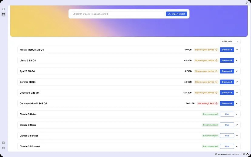 - 모델 사용 준비 완료: Jan을 다운로드하면 이미 설치된 모델 세트가 제공되어 시작할 수 있습니다. 특정 모델을 검색할 수도 있습니다.
