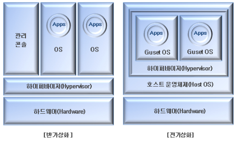 전가상화는 윈도우에서 리눅스까지 다양한 운영체제를 이용할 수 있는 구조로 Guest OS의 수정없이 하드웨어를 완전히 가상화하는 방식을 말하고,