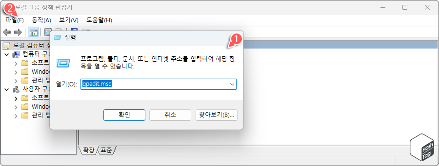 단축키 Win + R 키를 누르고 실행 대화 상자에 gpedit.msc 입력 후 Enter 키를 눌러 로컬 그룹 정 편집기를 실행합니다.