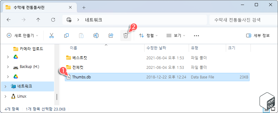 ‘Thumbs.db’ 파일을 선택하고 [삭제] 버튼을 클릭합니다.