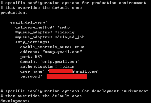 처음 default 구역 말고 최 하단에 production: 영역에 아래와 같이 이메일 발송에 쓸 정보를 추가한다.