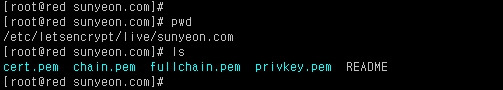 인증서가 정상적으로 발급이 되면 /etc/letsencrypt/live/sunyeon.com(도메인이름) 경로에 아래와 같이 인증서가 생성이 된다.