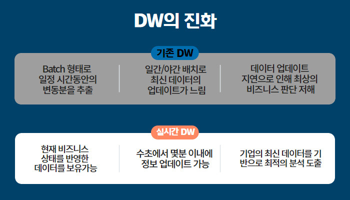 실시간 DW (Real time DW)란 DW가 현재 비즈니스 상태를 반영한 데이터를 보유하고 있다는 의미로, 실시간 비지니스 이벤트가 DW에 수초 또는 몇 분 이내에 반영되는 것을 말한다. 기존의 DW는 batch 형태로 일정 시간의 변동분을 추출하며, 보통 daily (nightly) batch로 변동 데이터를 추출해 DW로 전송했다. 이로 인해 DW는 전일 자료를 근간으로 작성되기에 경영자는 전일 자료를 근거로 판단을 내려야 하는 번거로움이 있었다.
