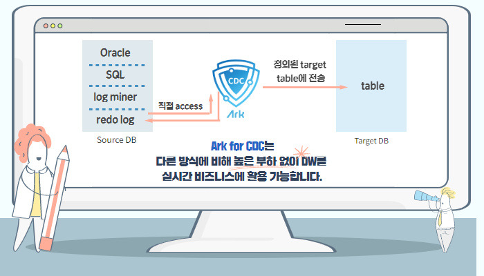 Ark for CDC는 Oracle database의 transaction log 인 redo log 와 archive log file을 직접 access해 변경데이터를 추출한다. 추출한 데이터는 즉시 정의된 target의 table에 전송 및 반영되기에, 실시간 DW를 위해 소스시스템에 별도의 높은 부하를 유발하지 않고 DW에 실시간 비지니스 상황을 반영할 수 있다.