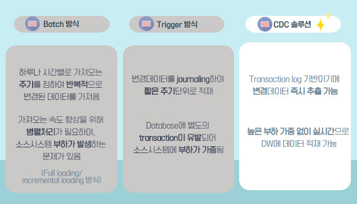 이와 같은 실시간 DW가 가능하려면 소스시스템에서 DW로 데이터가 얼마나 빨리 적재할 수 있는지가 핵심이다.