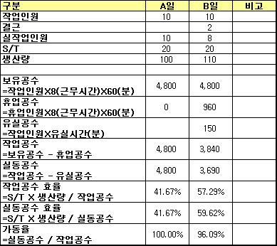 3-2. 유실공수 : 어떤 예측 가능 또는 불가능한 여러가지 이유에 의해 라인이 생산활동을 하지 못하고 비가동이 발생된 시간을 유실공수라고 합니다. 유실공수 = 유실시간 * 대상인원이 되겠습니다.