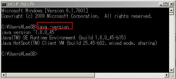 아래와 같이 Java의 버전이 출력되면 설치OK 입니다. 붉은 사각형의 바로밑에 표시된 버전은 1.8.0_45 입니다.