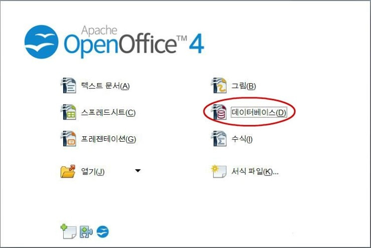 1) OpenOffice를 실행시켜서 나온 메뉴에서 [데이터베이스]를 클릭합니다.