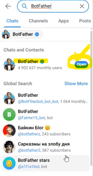 1-1. 첫 번째로 Telegram 검색창에 `BotFather`를 검색하여 공식 인증 마크가 있는 봇의 'Open'버튼을 눌러줍니다.