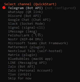 위 ~ Step 2까지 설정들이 모두 완료 되었으면, Select channel 창이 팝업이 되는데요, 여기서 오늘 저희는 Telegram 실습을 할 것이기 때문에, Teleram을 선택해줍니다.