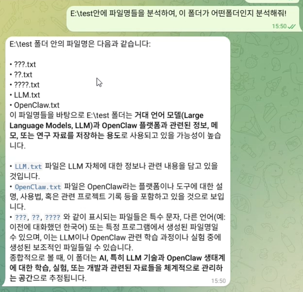 우선 로컬 컴퓨터의 파일 이름들을 통해, 해당 폴더의 역할을 요약해보도록 하겠습니다. 아래와 같이 Telegram bot에 원하는 폴더명과 이를 요약설명해달라는 프롬프트를 입력해주시면 되는데요. 그러면 아래와 같이, LLM이 알아서 로컬 컴퓨터에 접근해 명령을 이행해줍니다.
