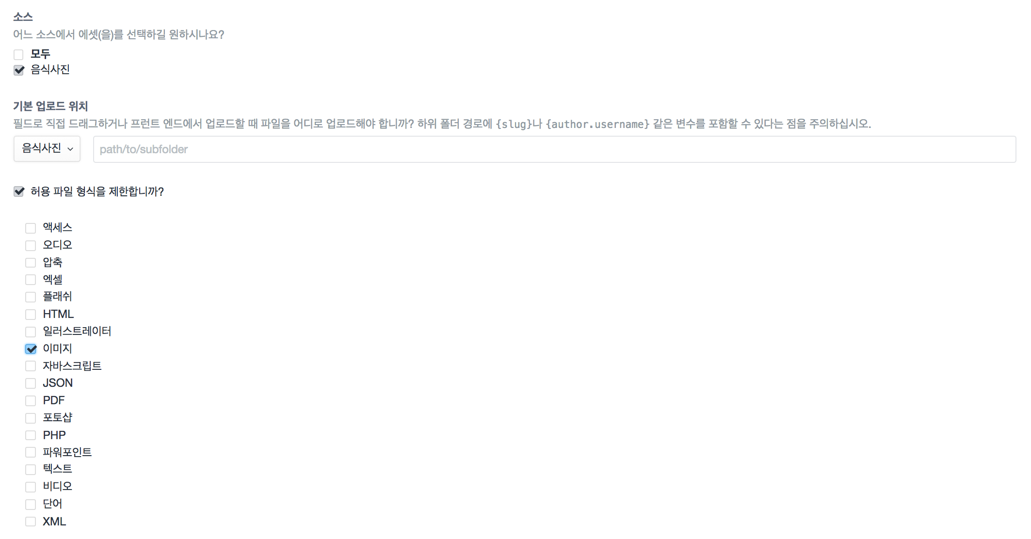 소스를 제한하고 기본 업로드 위치를 방금 전 만든 에셋인 ‘음식사진’으로 맞추자.