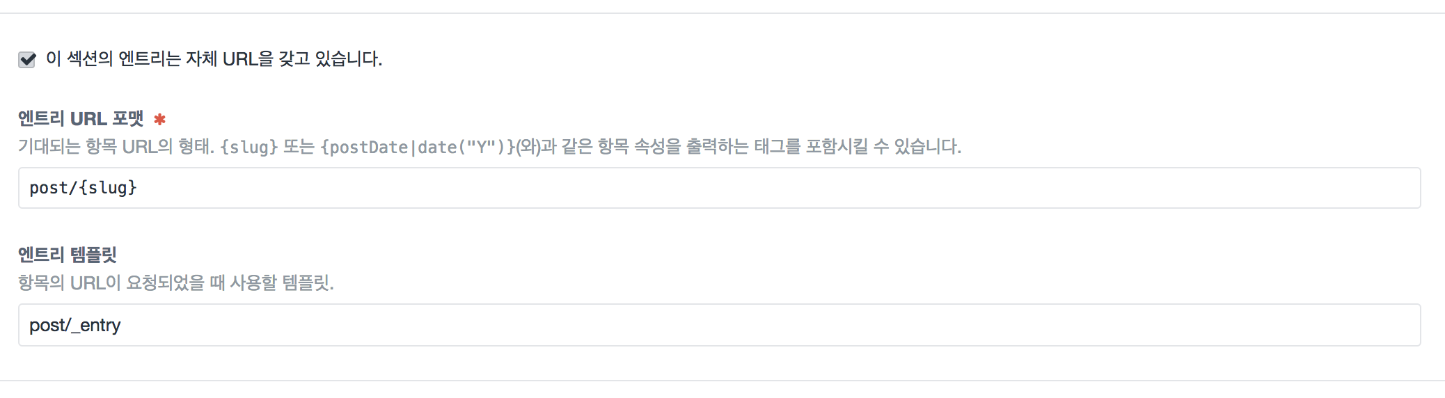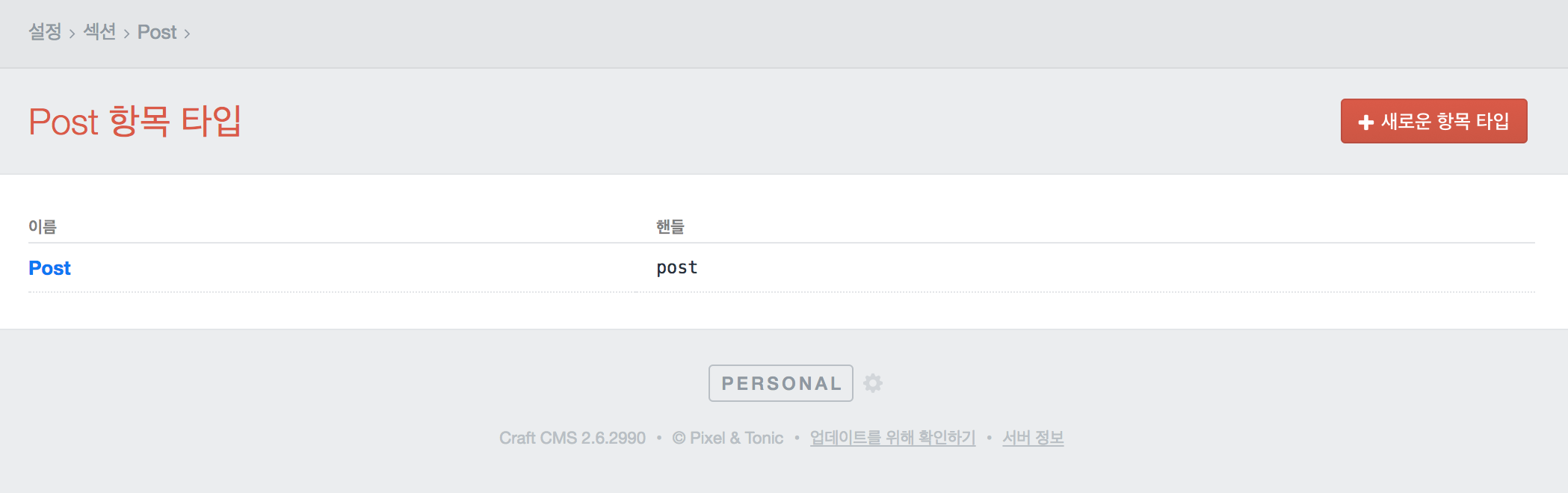 여기서 “엔트리 유형 편집하기”를 클릭하면 Post 항목 타입도 이미 만들어져 있음을 알 수 있다. 이 때의 Post는 ‘섹션’이 아니라 엔트리, 즉 ‘항목(Entry)’이다. Craft가 섹션을 만들면서 그 섹션에 해당하는 항목도 자동으로 만들었다. (나중에 다시 얘기하겠지만 Craft에서 하나의 섹션에는 반드시 하나의 항목만 들어가는 게 아니다. 하나 이상의 항목을 가질 수 있다. 그래서 섹션 아래에 항목을 둔 것이다. 여기서 Post 항목은 Post 섹션을 만들 때 디폴트로 생성된 항목일 뿐이며, 원하면 얼마든지 새로운 항목을 Post 섹션 내에 추가할 수 있다)