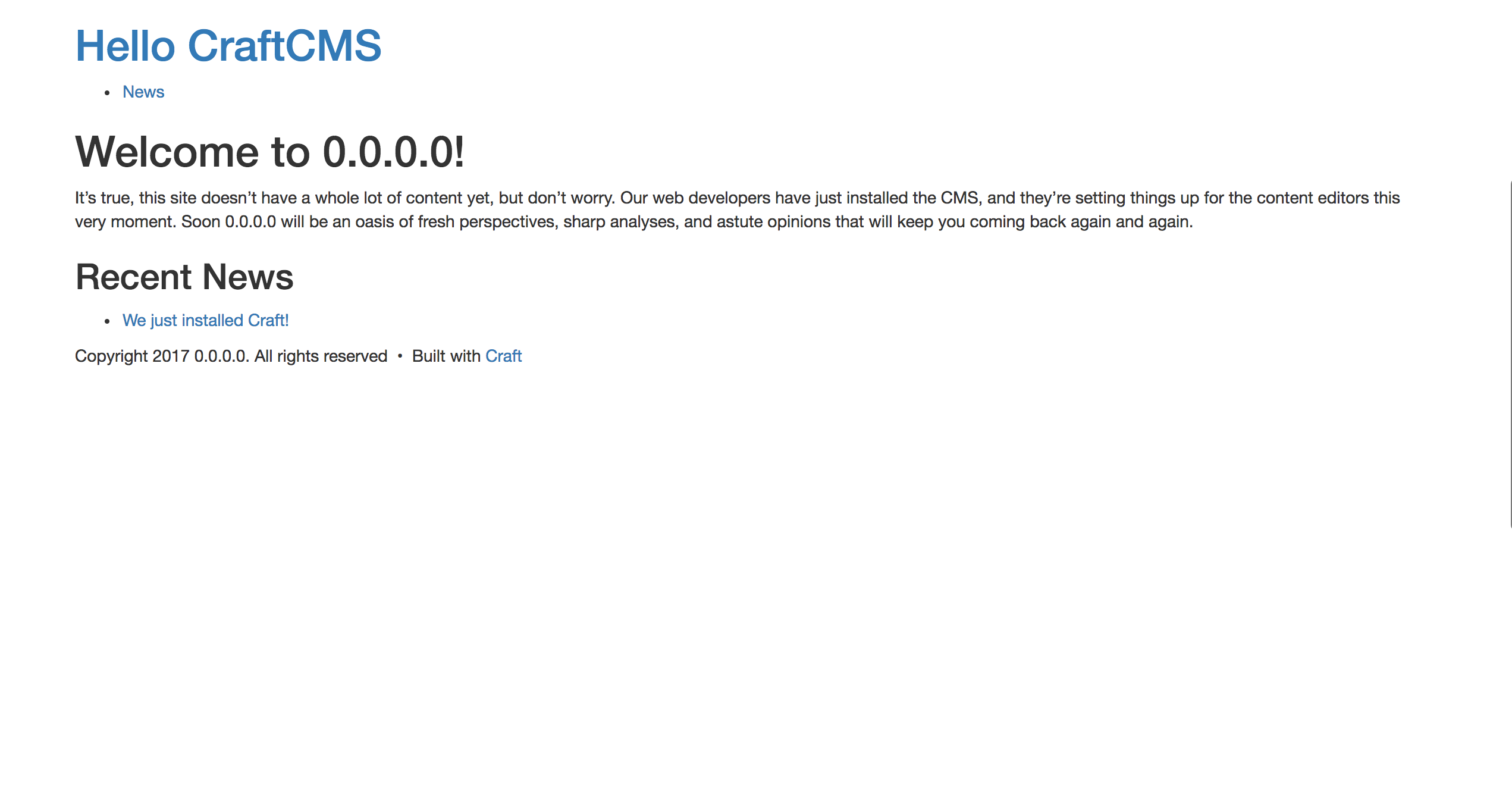 워드프레스와 달리 Craft에는 테마가 없다. 따로 테마(theme)라는 개념이 없다. 처음 설치를 완료하고 웹사이트 URL로 접속하면 아래와 같이 그냥 허접한 Welcome 페이지만 덩그러니 자리잡고 있을 뿐, 워드프레스처럼 테마를 선택하거나 교체하는 그런 건 없다.