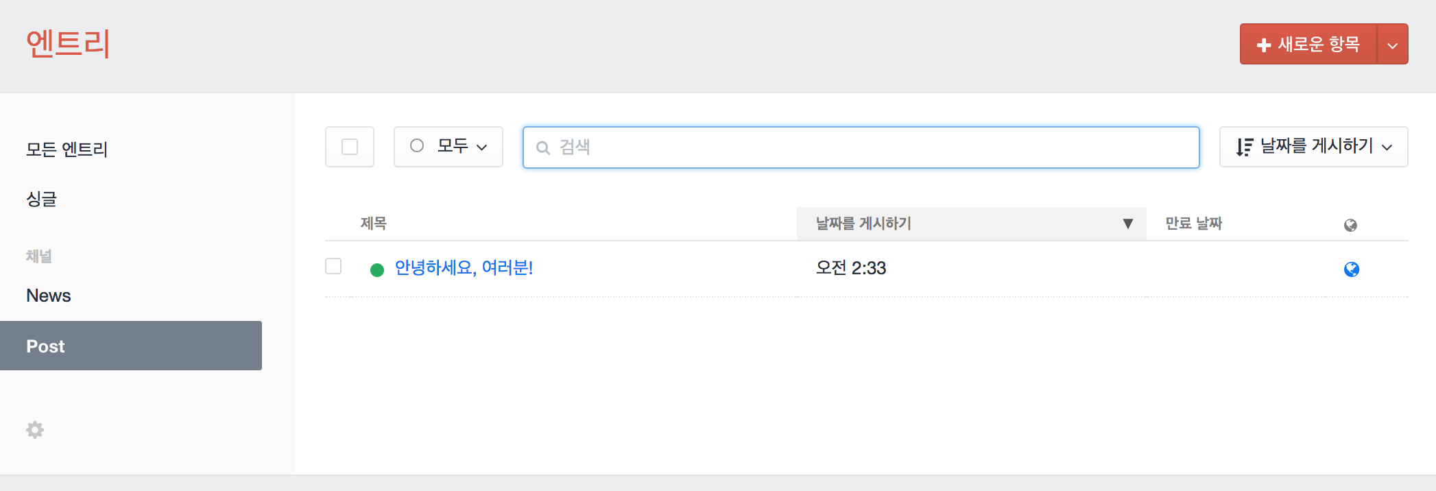 Post 항목을 만들었으니 이제 이 항목으로 실제 콘텐츠를 하나 만들어 보자. CP에서 “엔트리” 메뉴를 클릭하자. 채널 메뉴 아래에 ‘Post’ 채널이 추가되어 있을 것이다.