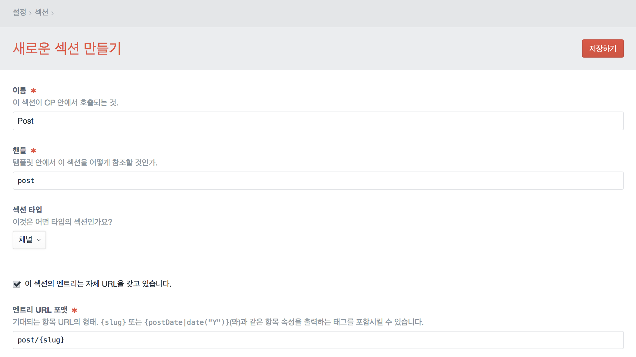 새로 채널 섹션을 하나 만들자. 이름을 ‘Post’로 주고 섹션 타입은 ‘채널’로 맞추고 나머지는 그대로 둔다.