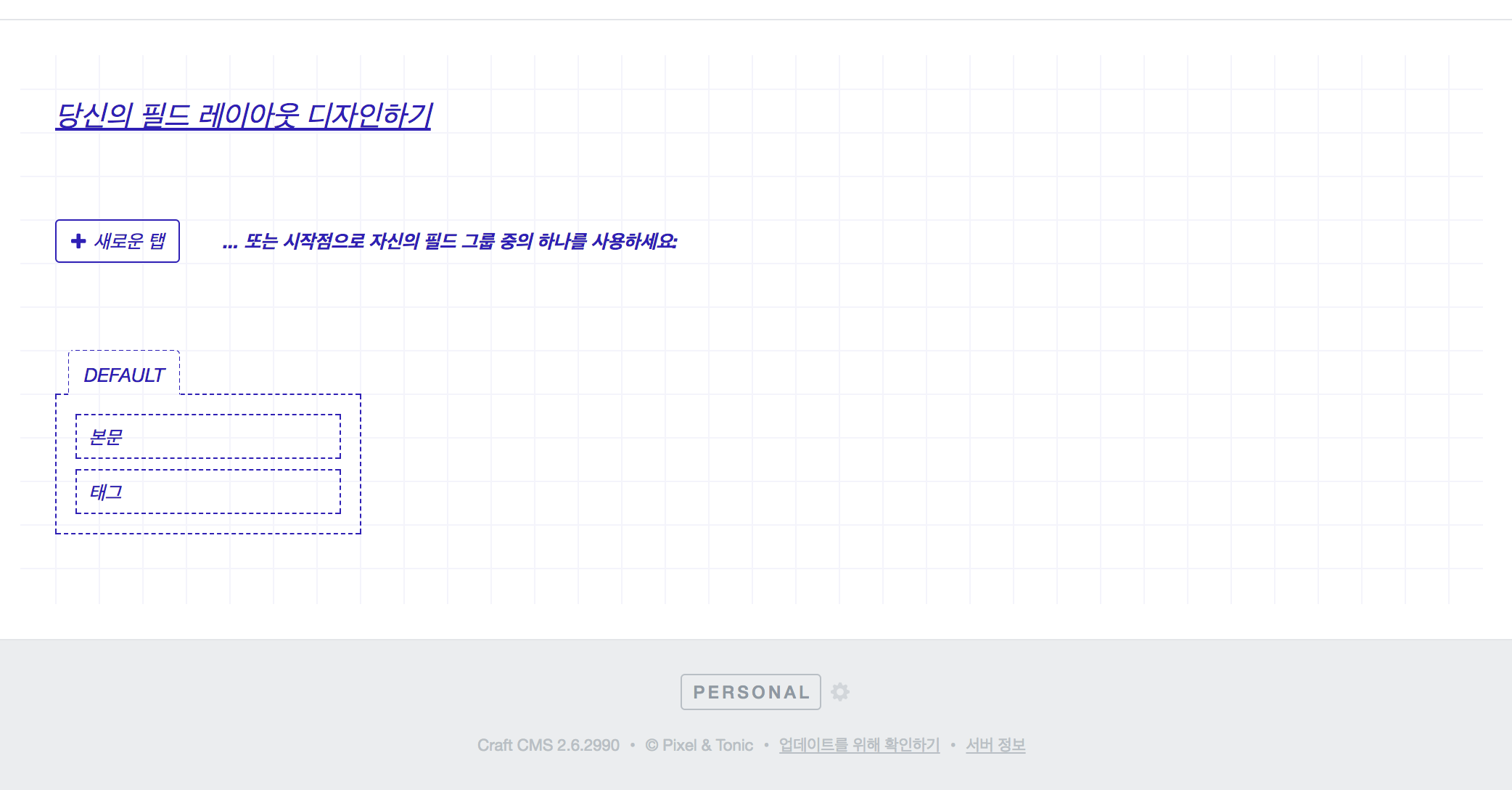 자, 그럼 이제 Craft의 핵심인 콘텐츠를 한번 만들어 보자. 우선 간단하게 블로그에서 주로 쓰이는 포스트(post)를 한번 만들어 보기로 하자.