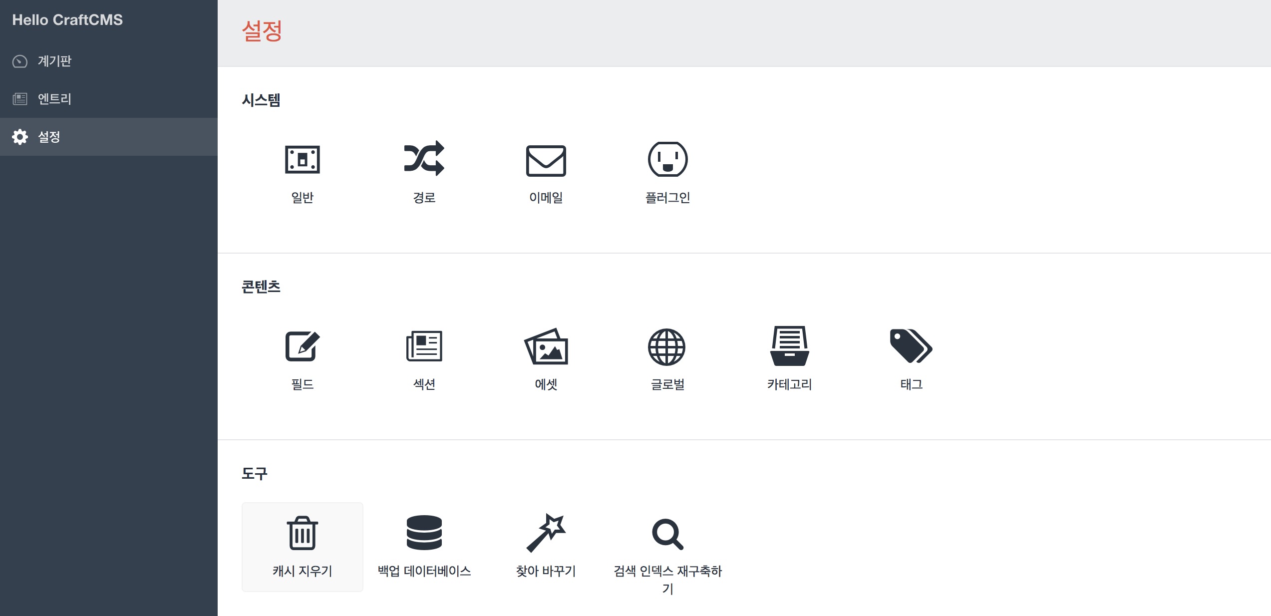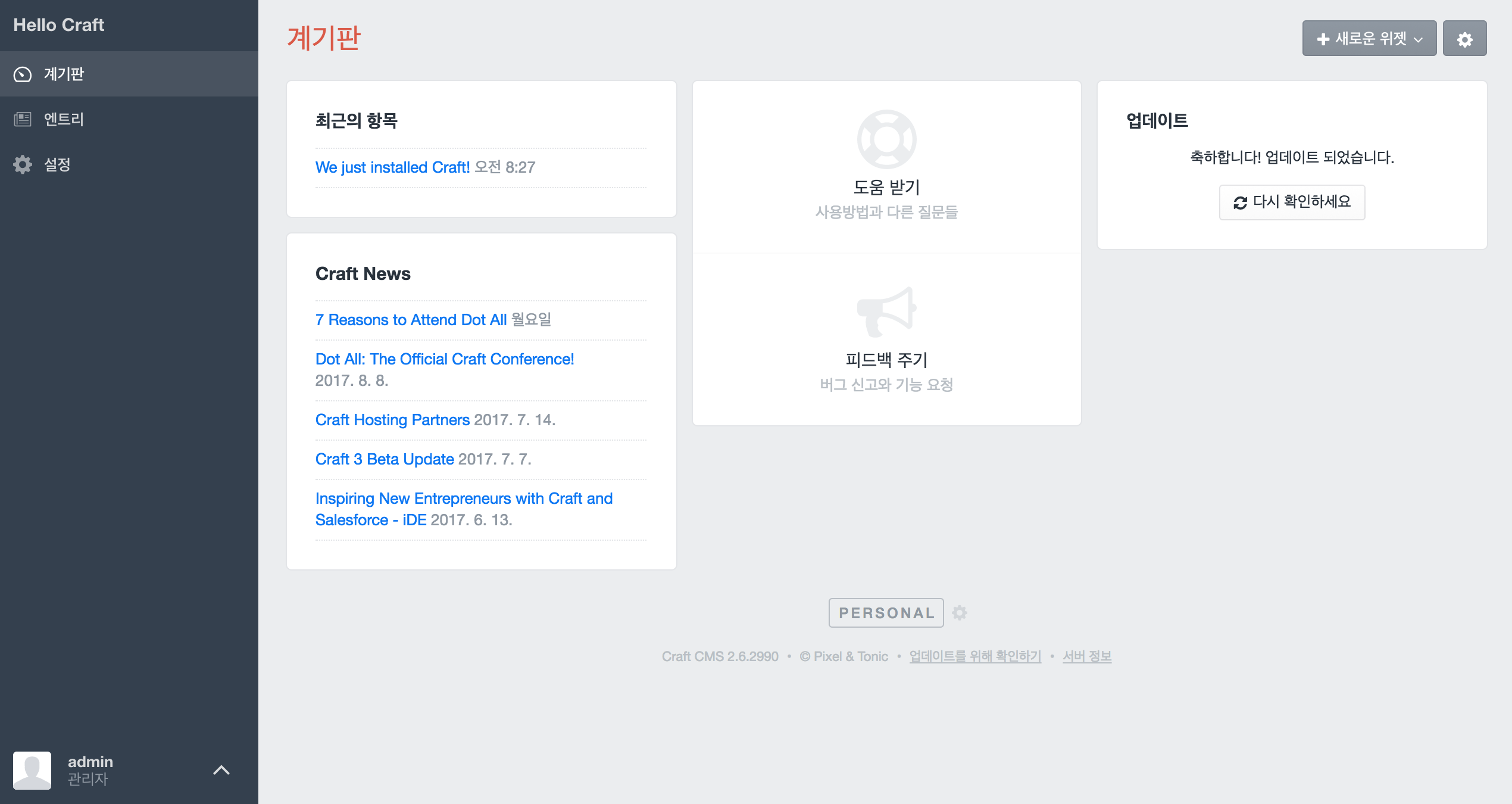 Craft CMS에 접속하여 ‘계기판(Control Panel)’이 나오면 설치가 끝난 것이다.