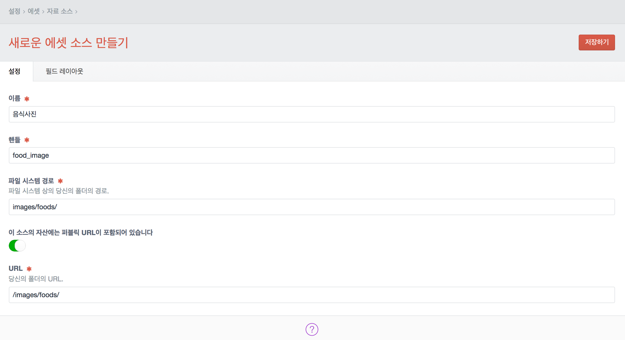 “+ 새로운 자료 소스” 버튼을 눌러 다음과 같이 새로 에셋을 추가하자. 이름은 아무렇게나 줘도 되지만 여기서는 ‘음식사진’이라고 정했다. 핸들값은 나중에 템플릿에서 이 에셋을 참조할 때 사용할 값이다. 파일 시스템 경로는 실제로 이 이미지 파일이 업로드되었을 때 저장될 경로로, 여기서는 public 폴더 아래에 있는 images_foods_ 라는 폴더에 저장할 것이기에 그렇게 지정했다(이 폴더는 실제로 지정된 위치에 존재해야 한다. 없으면 만들어 주자!) 마지막으로 URL은 이 이 에셋(이미지)이 브라우저를 통해 표시될 때 사용될 경로를 지정한다.