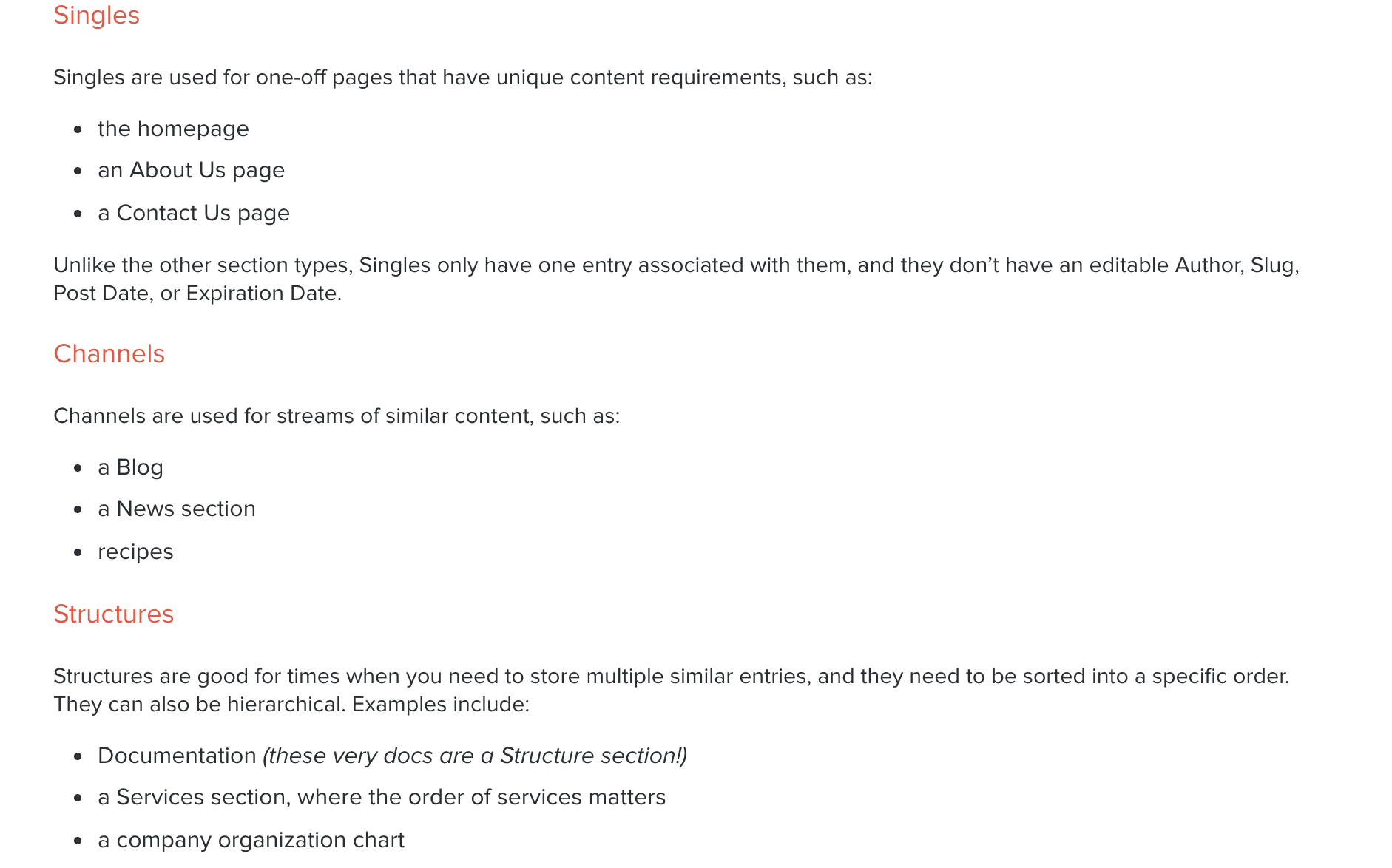 Craft의 섹션 유형에 관한 더 자세한 내용은 Craft 문서를 참조하면 된다.