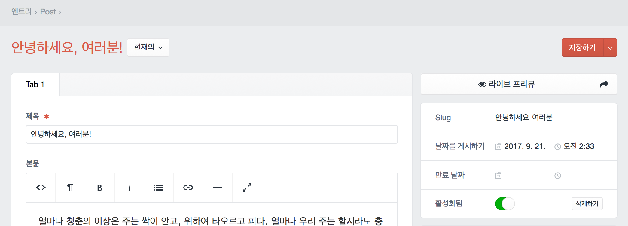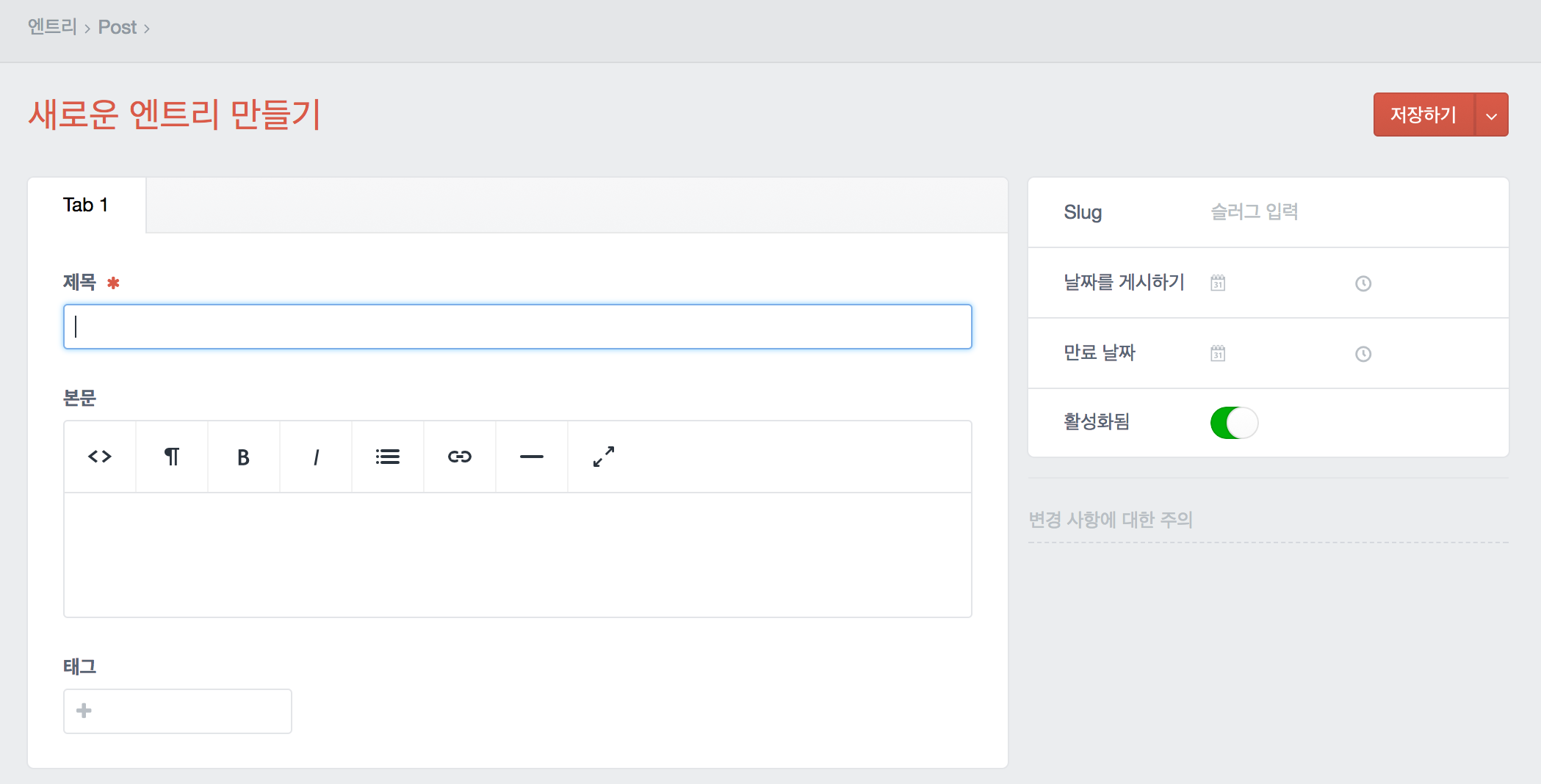 Post 라는 엔트리를 클릭해 보면 아무 것도 없는 빈 목록이 표시된다. 새로 포스트를 하나 만들어 보기로 하자. 상단의 “+새로운 항목” 버튼을 클릭하여 “Post” 를 선택하면 다음과 같이 새로운 엔트리 만들기 화면이 표시된다.
