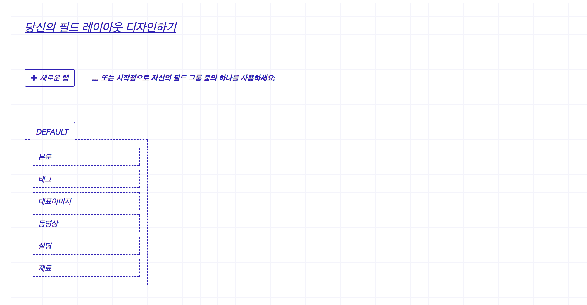 항목 보기 하단에는 ‘필드 레이아웃 디자인’ 이라는 영역이 보일 것이다. 이 부분이 항목의 필드 정보를 디자인하는 부분이다. 항목을 하나의 콘텐츠라고 한다면, 바로 여기서 콘텐츠를 구성하는 필드들의 정보를 구성할 수가 있다.