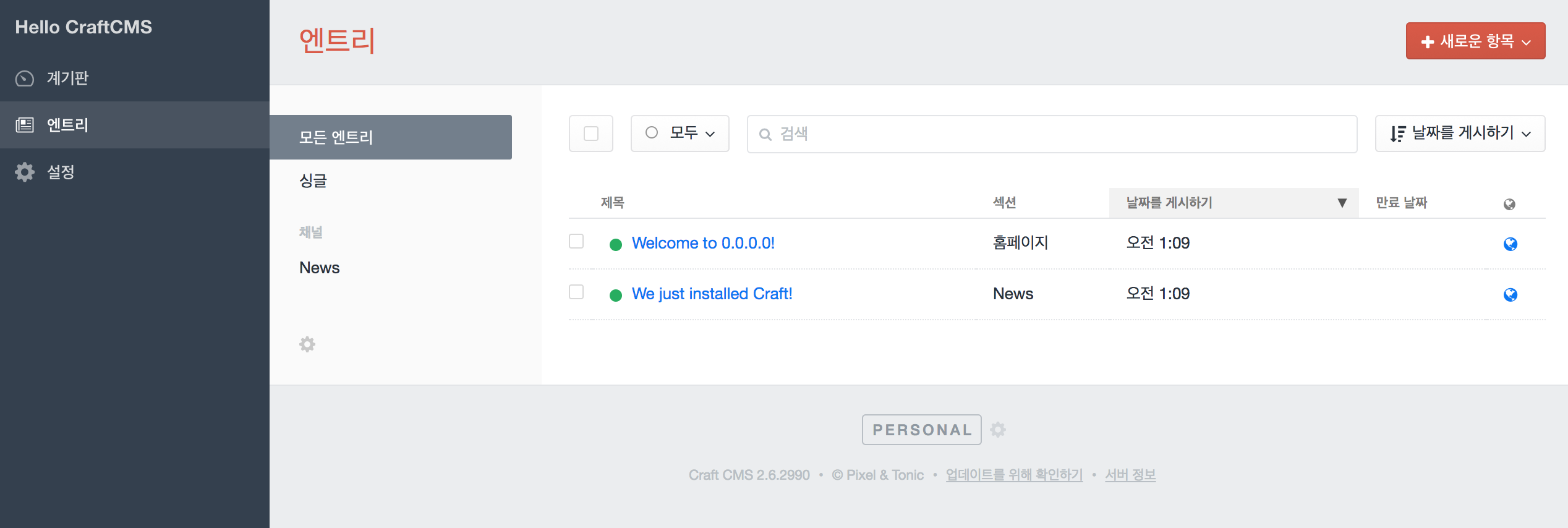 어드민 대시보드(Craft에서 이를 Control Panel이라고 하며 흔히 줄여서 ‘CP’라고도 함)에 접속하여 “엔트리” 메뉴를 클릭하면 다음과 같이 보인다. ‘싱글’이라는 게 있고, ‘채널’이라는 제목 아래 ’News’라는 것도 보일 것이다.