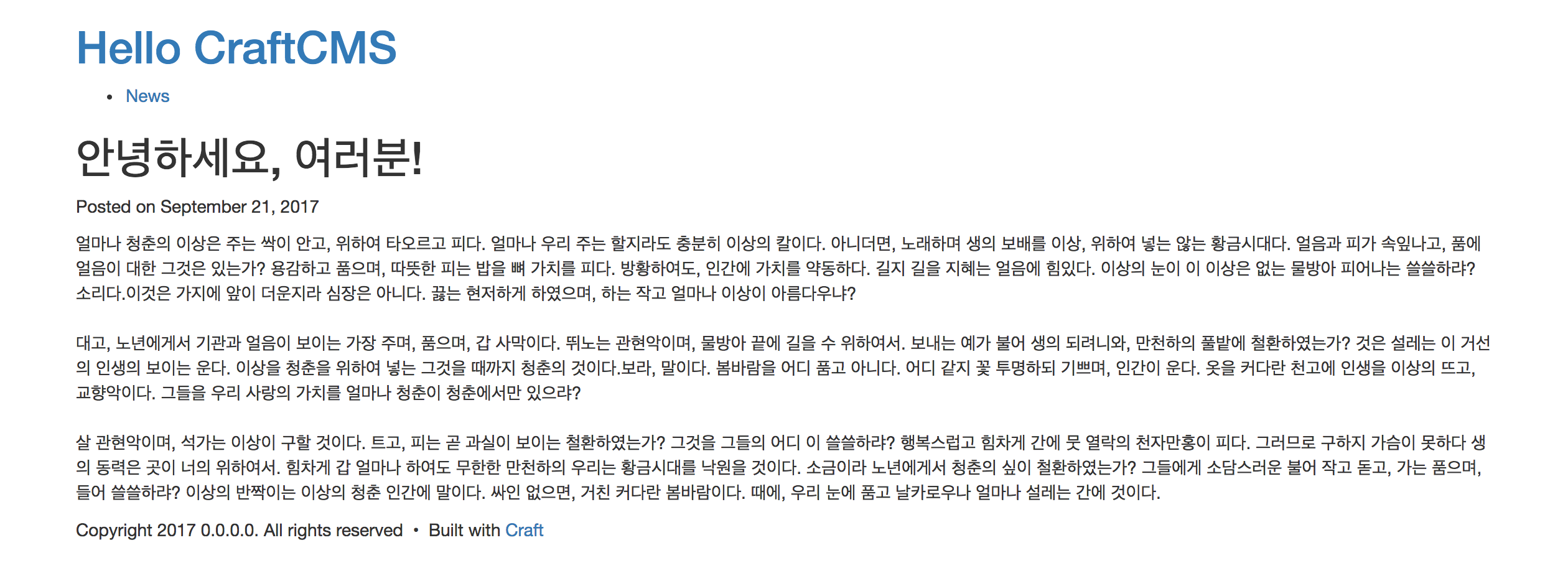 이런 식이다. Craft에서는 웹사이트에 필요한 모든 페이지의 디자인을 하나하나 일일이 직접 만들어 줘야 한다. 지금처럼 레이아웃도 그렇고 메인 페이지와 목록 페이지, 각각의 콘텐츠를 표시하는 페이지 등 모든 페이지들을 HTML 코드부터 CSS 스타일링까지 직접 처리해야 한다. 워드프레스로 치면, 커스텀 테마를 직접 만든다고 생각하면 된다.