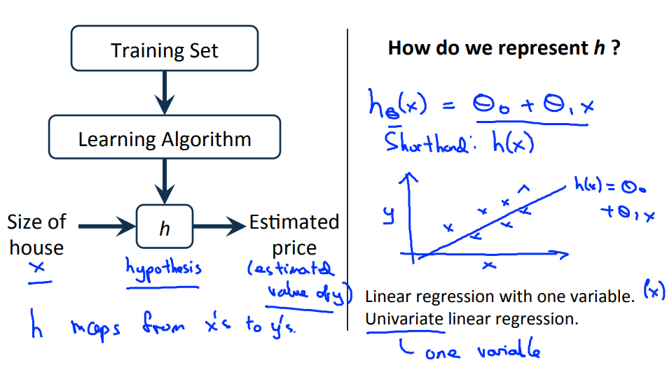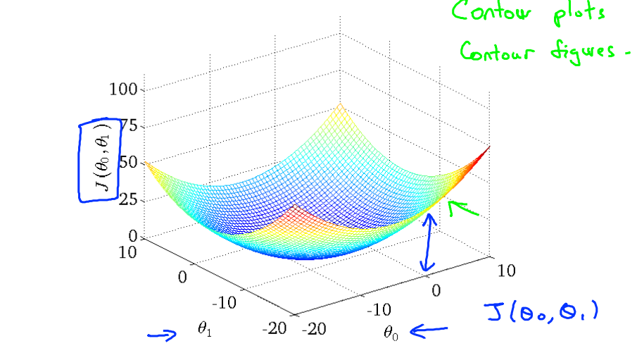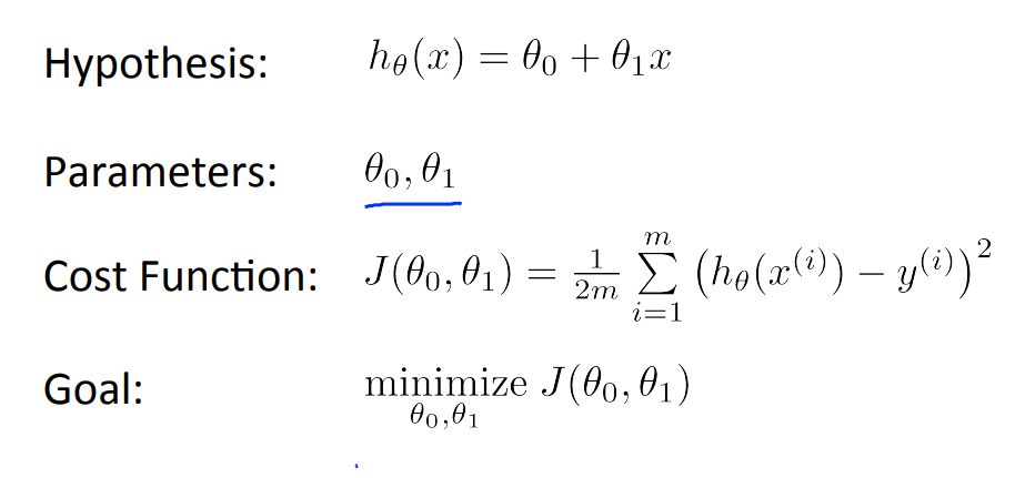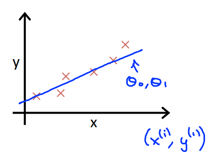 주어진 데이터 x,y를 통해 최적의 theta1, theta2를 찾는것을 의미한다.