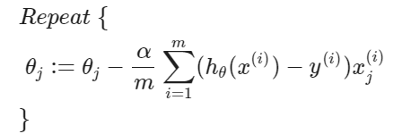 비용 함수 J에 대해 미분값에 alpha를 곱한 값을 원래의 파라미터 theta_j에 대해 빼서 새로운 theta_j를 구한다.