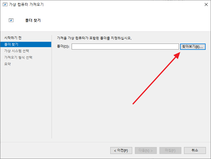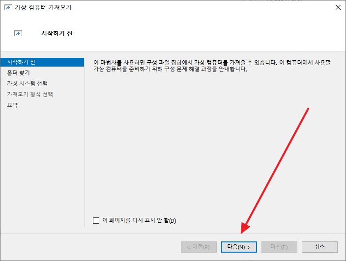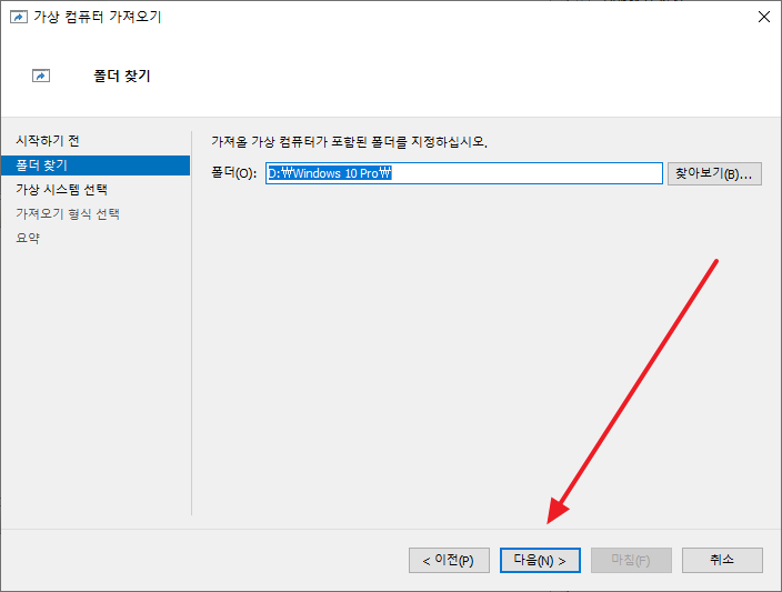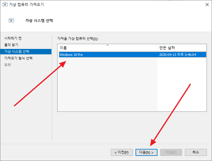 - 가져올 가상 컴퓨터를 선택하고, [다음]을 클릭합니다.
