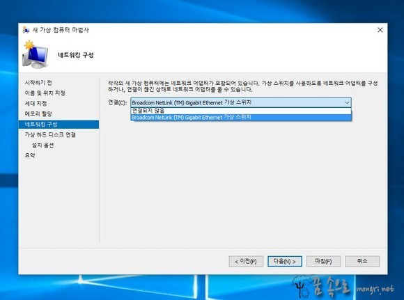연결에서 미리 만들어 놓은 가상 스위치를 선택한 후 다음 버튼을 클릭합니다. 가상 스위치는 '하이퍼브이 네트워크 가상 스위치 만들기' 글을 참고하시고 만들면 되겠습니다.