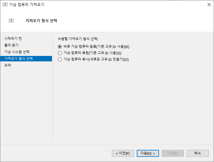 가져오기로 선택한 가상 컴퓨터 파일들을 이동하지 않고 그대로 사용합니다. 가상 컴퓨터마다 ID가 있는데, 그 ID도 유지합니다. - 가상 컴퓨터 복원(기존 고유 ID 사용)
