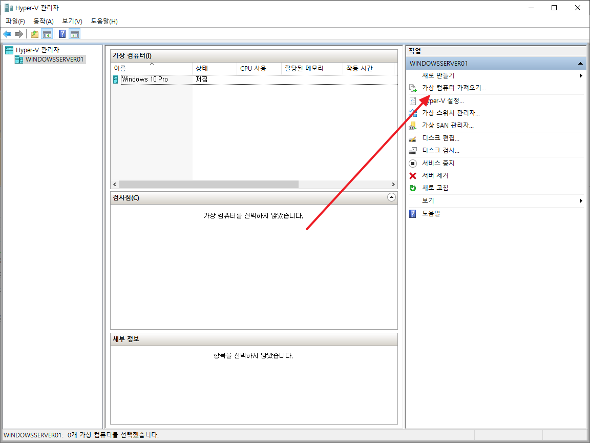 - 오른쪽 작업에서 [가상 컴퓨터 가져오기]를 클릭합니다.
