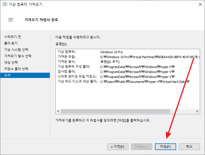 - 요약에서 작업할 내용을 검토하고 [마침]을 클릭하면, 가상 컴퓨터 가져오기가 완료됩니다.