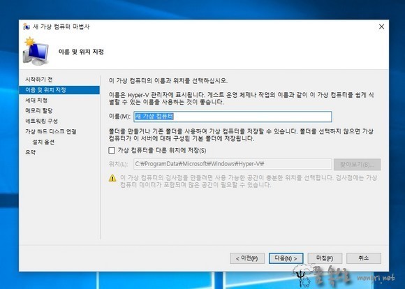 이름에는 가상 컴퓨터의 이름을 입력하고, 위치는 기본 위치를 사용하거나 찾아보기를 이용하여 저장 폴더를 지정해 줍니다. 저장 위치를 변경하려면 다른 위치에 저장을 체크해야 하는 것은 잘 아시죠? 가상 컴퓨터의 이름 및 위치 설정이 끝났으면 다음 버튼을 클릭합니다.