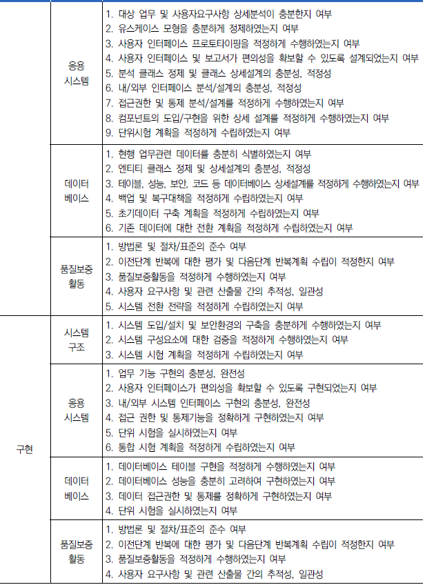 | 설계 | 1. 시스템 구성요소에 대한 상세설계를 충분하게 수행하였는지 여부 2. 시스템 보안에 대한 상세설계를 적정하게 수행하였는지 여부 3. 시스템 설치 및 검증 계획을 적정하게 수립하였는지 여부 4. 시스템 전환 계획을 적정하게 수립하였는지 여부 |