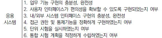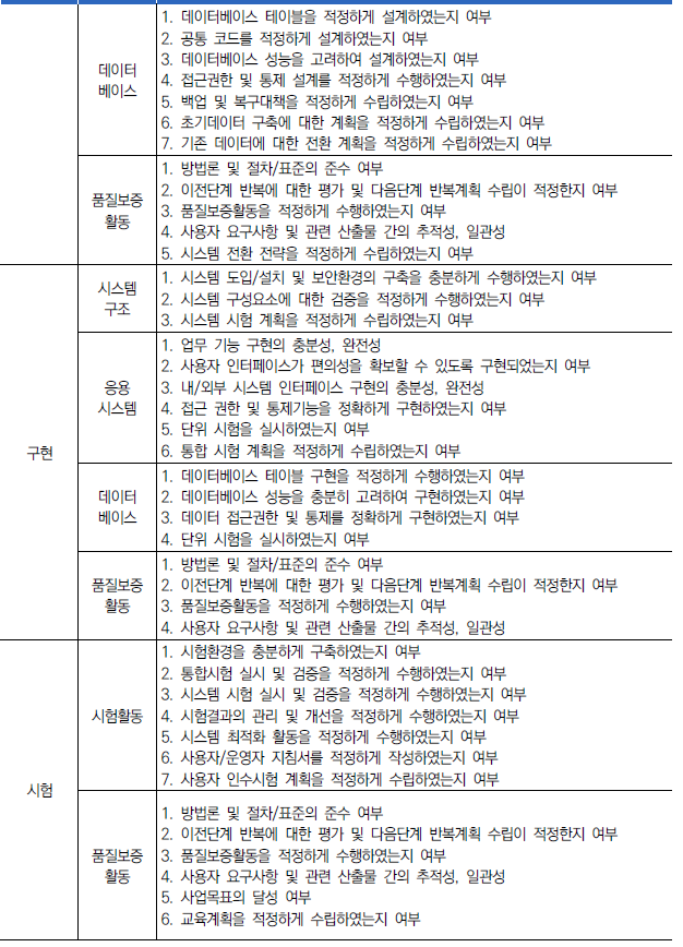 | 시험 | 시험활동 | 시험환경을 충분하게 구축하였는지 여부 통합시험 실시 및 검증을 적정하게 수행하였는지 여부 시스템 시험 실시 및 검증을 적정하게 수행하였는지 여부 시험결과의 관리 및 개선을 적정하게 수행하였는지 여부 시스템 최적화 활동을 적정하게 수행하였는지 여부 사용자 운영자 지침서를 적정하게 작성하였는지 여부 사용자 인수시험 계획을 적정하게 수립하였는지 여부 |