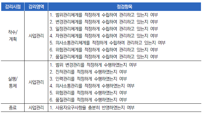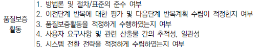 | 품질보증활동 | 1. 방법론 및 절차/표준의 준수 여부 2. 사용자 교육을 적정하게 실시하였는지 여부 3. 인수 운영조직을 적정하게 구성하였는지 여부 |